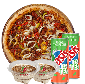 1 Pizza Medium au choix + 2 Desserts au choix + 2 Boissons 33cl au choix.