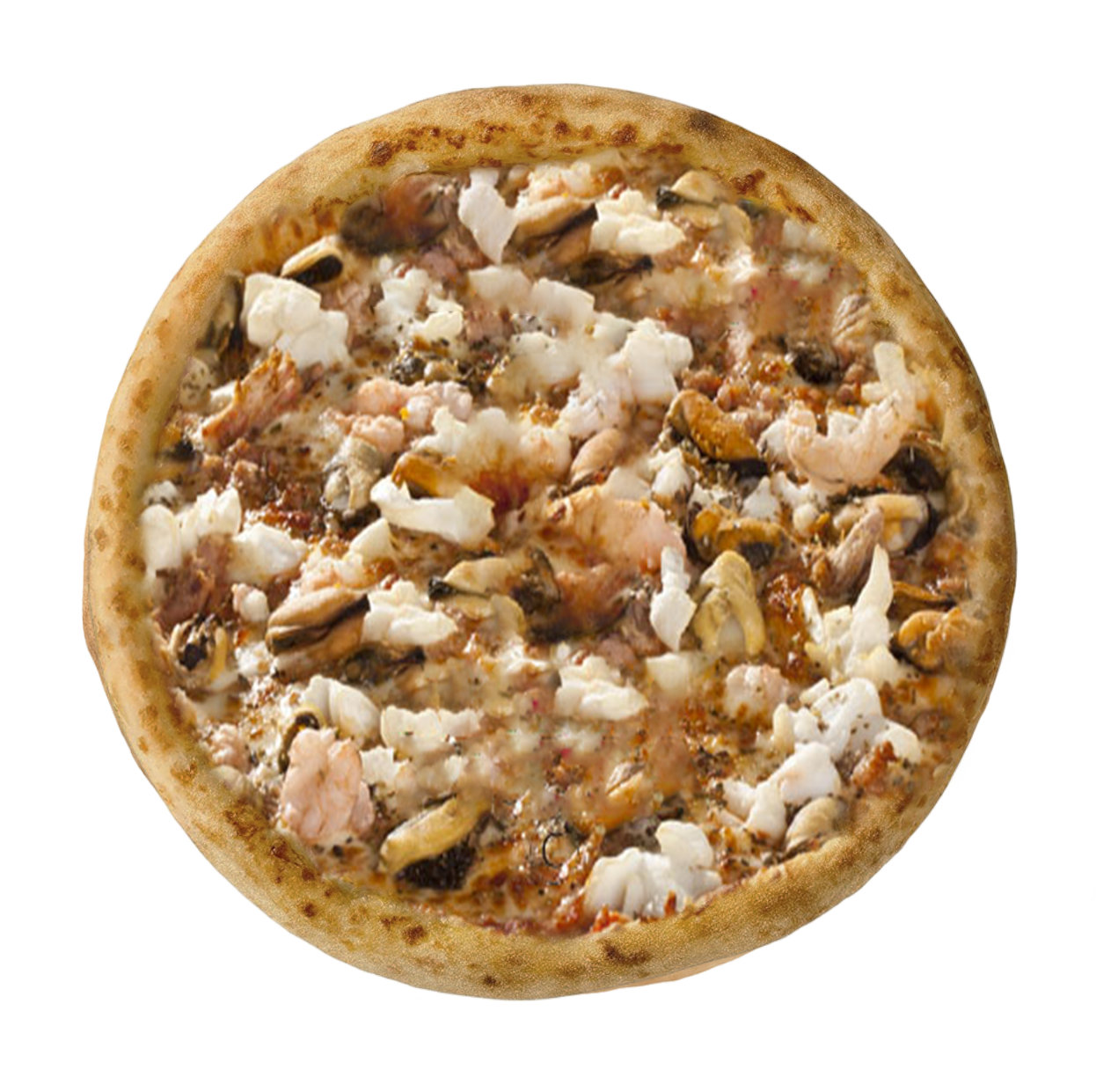 Sauce tomate, mozzarella, thon, cocktail de fruits de mer, herbes de provence.