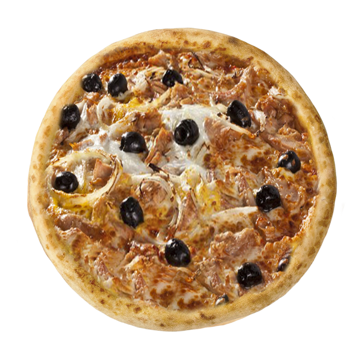 Sauce tomate, mozzarella, thon, oignons rouges, oeuf, olives.