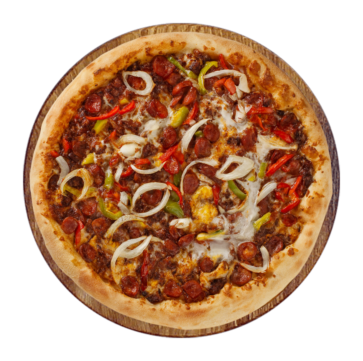 Sauce tomate, mozzarella, jambon, champignons, poivrons, pepperoni, cheddar.