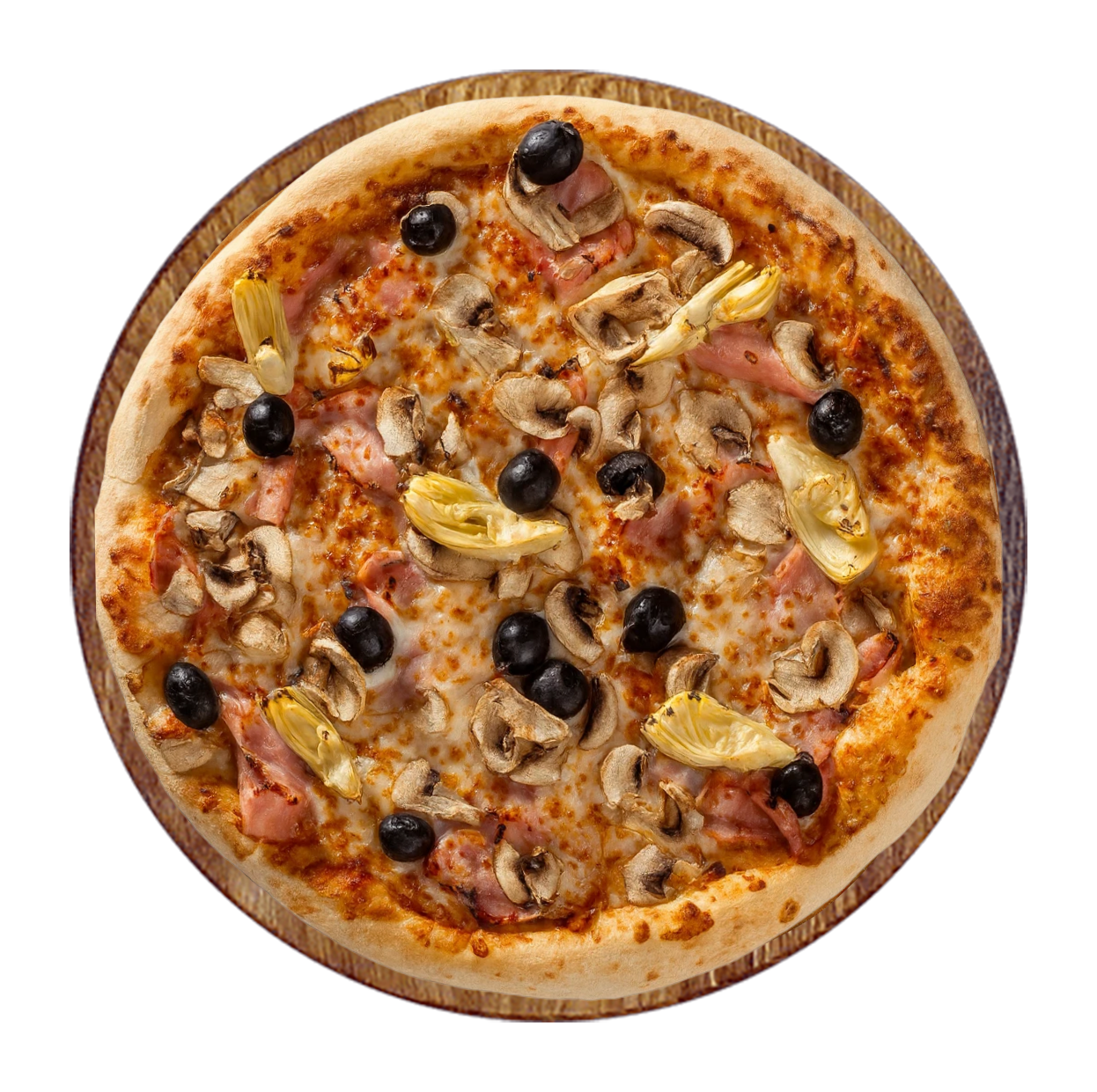 Sauce tomate, mozzarella, jambon, artichauts, champignons, olives.