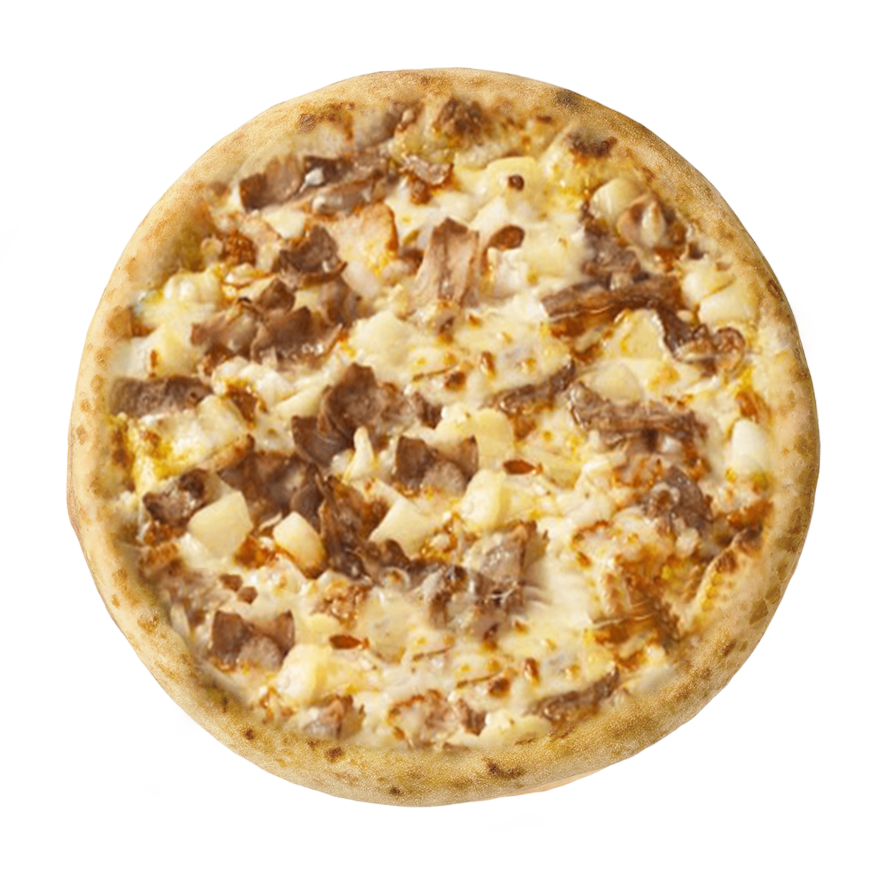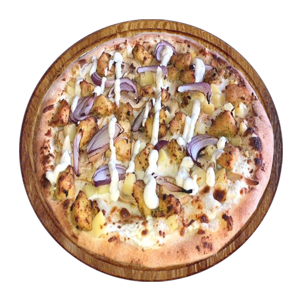 Crème fraîche, mozzarella, poulet fumé, oignons rouges, pommes de terre.