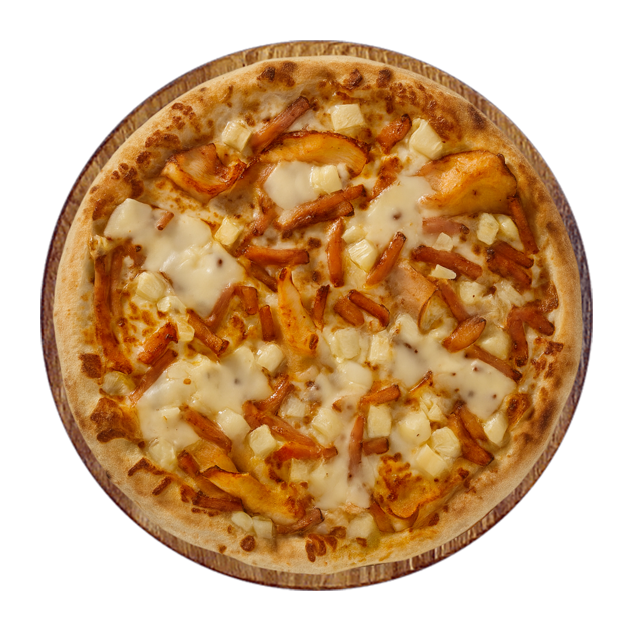 Crème fraîche, mozzarella, poulet fumé, chicken curry, champignons, cheddar.