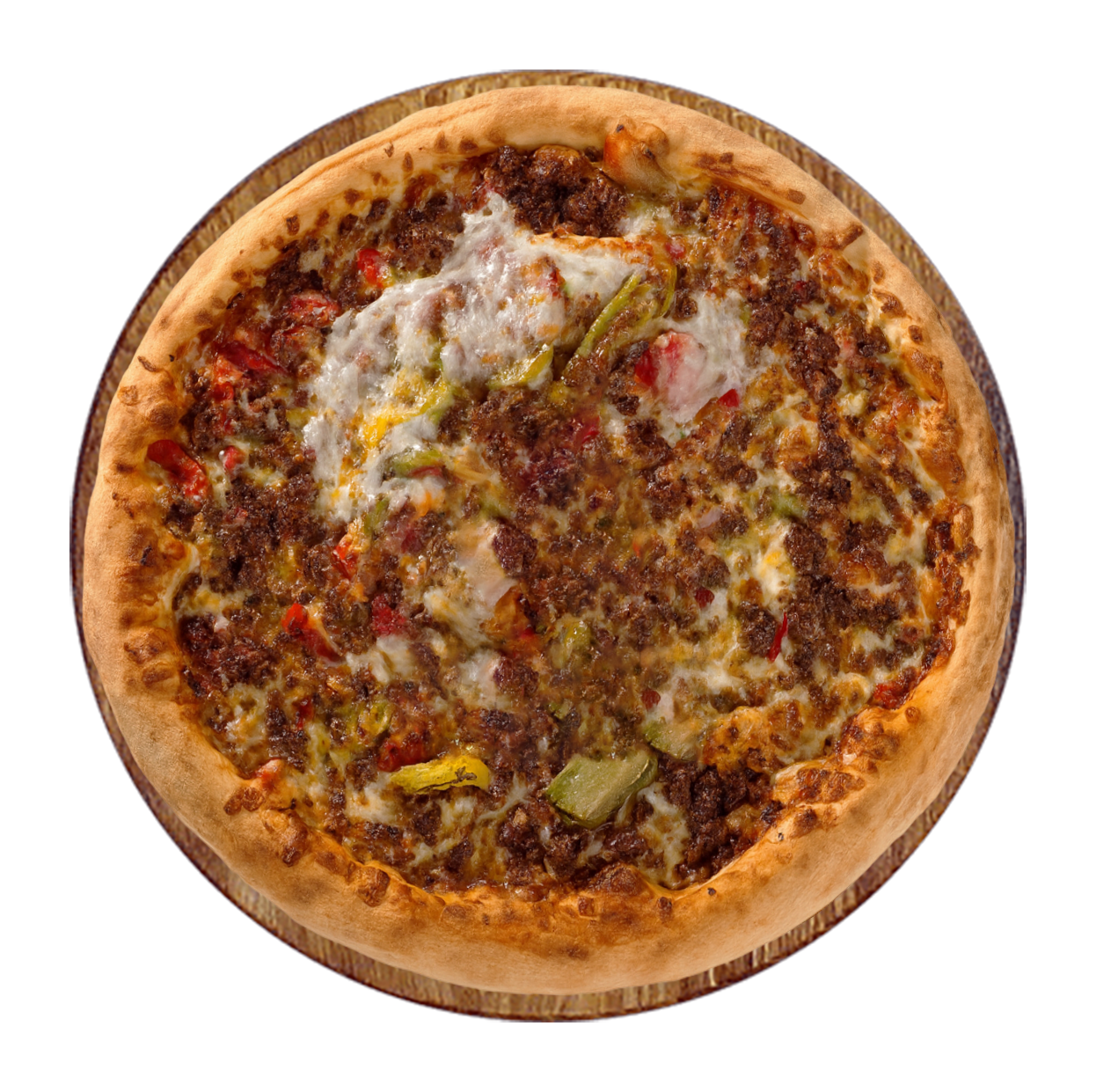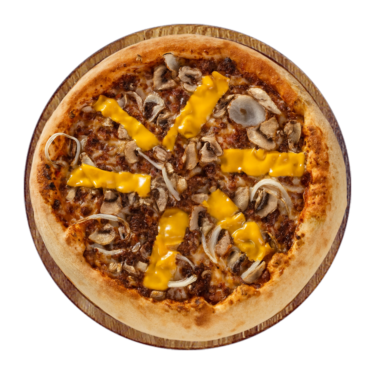 Sauce tomate, mozzarella, viande hachée, cheddar, champignons, oignons rouges.