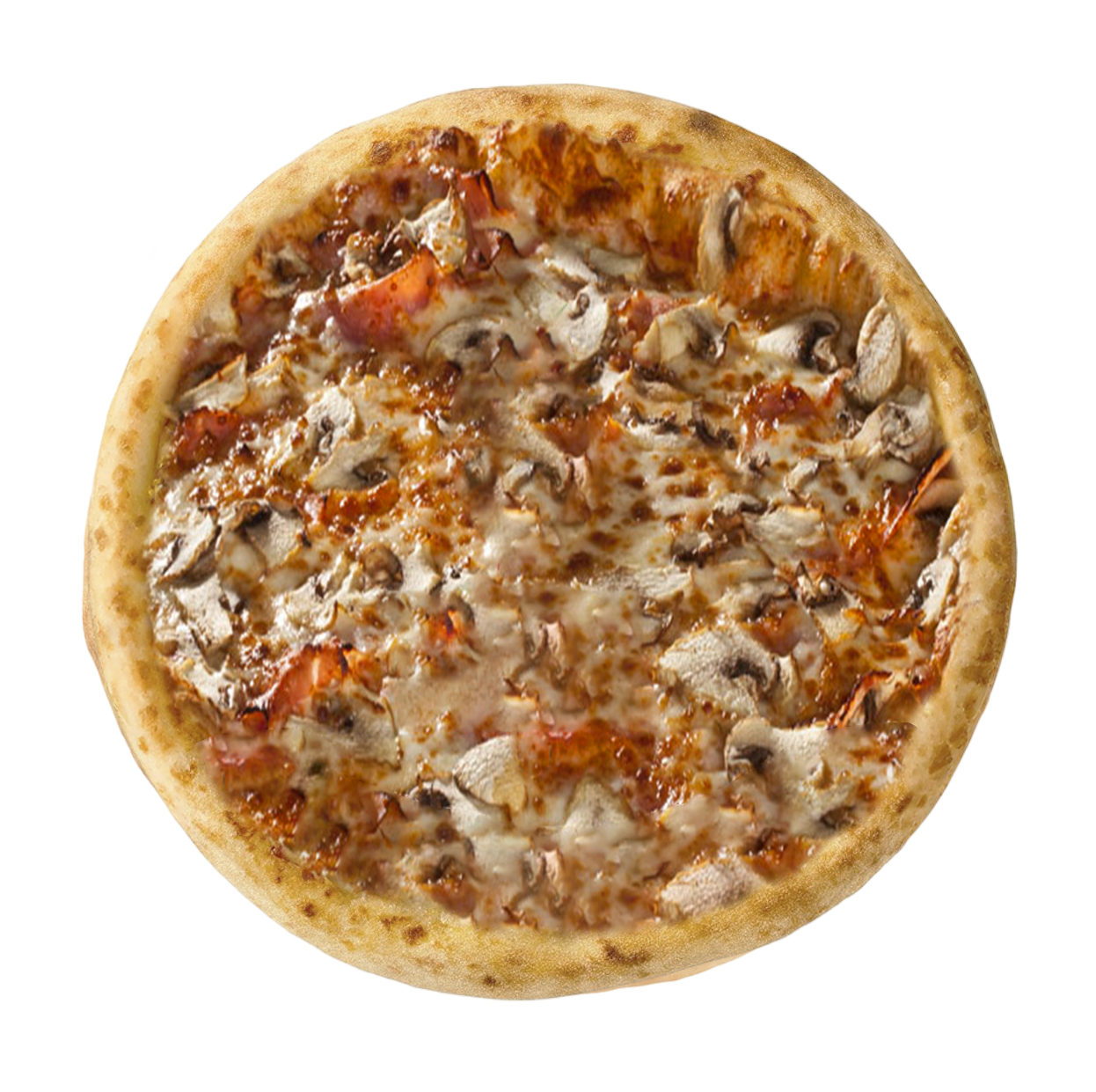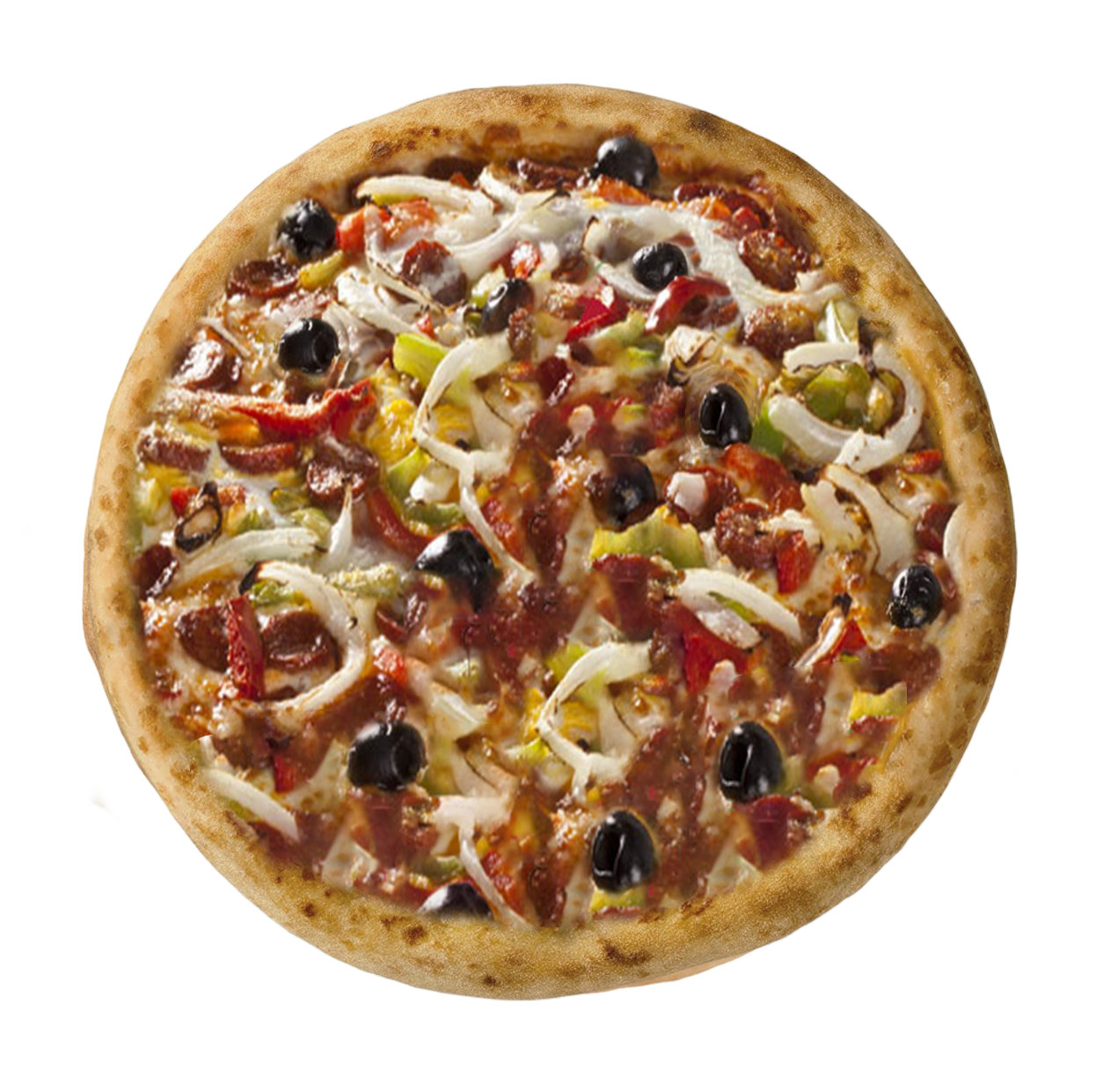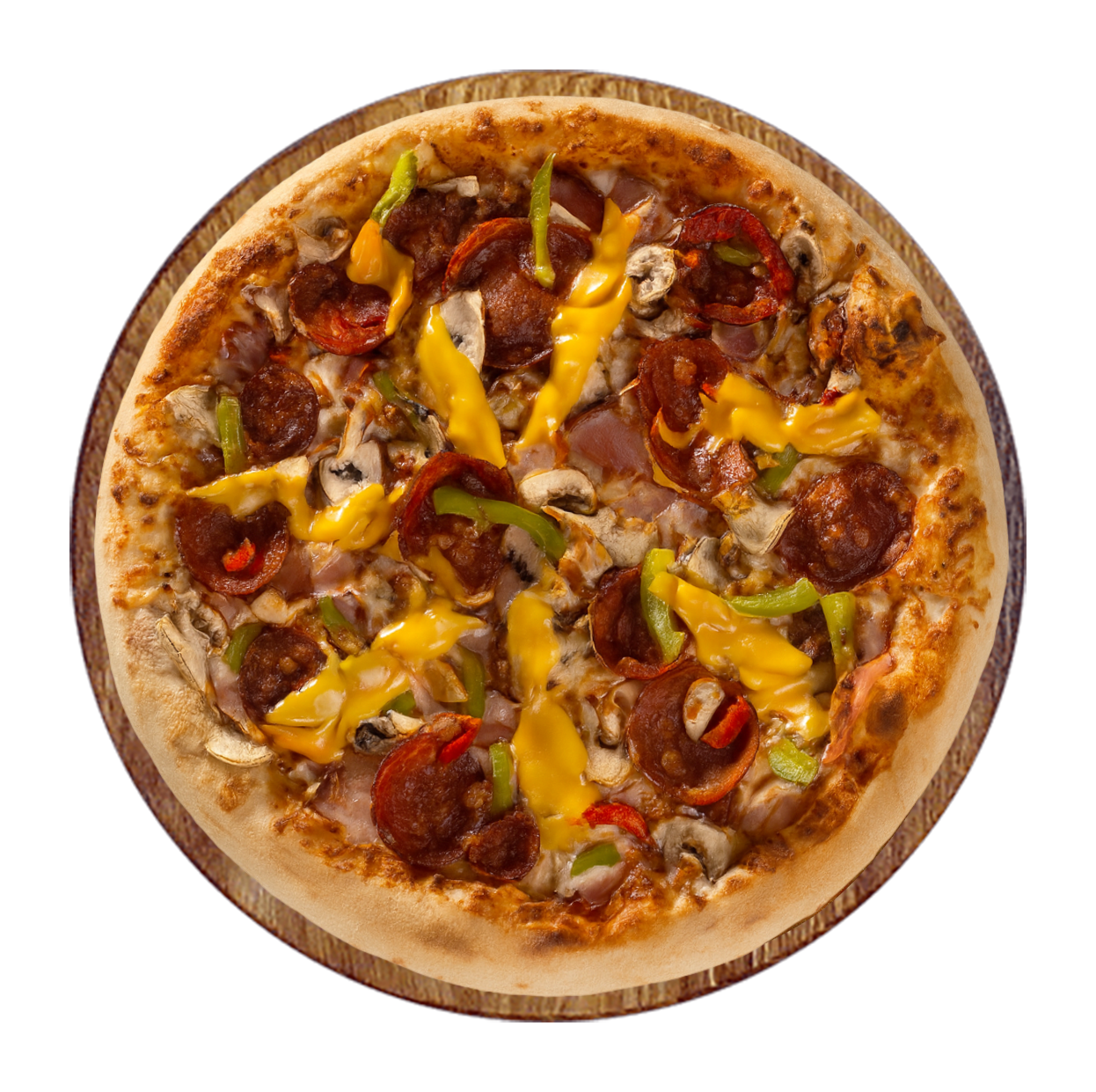 Sauce tomate, mozzarella, jambon, champignons, poivrons, pepperoni, cheddar.