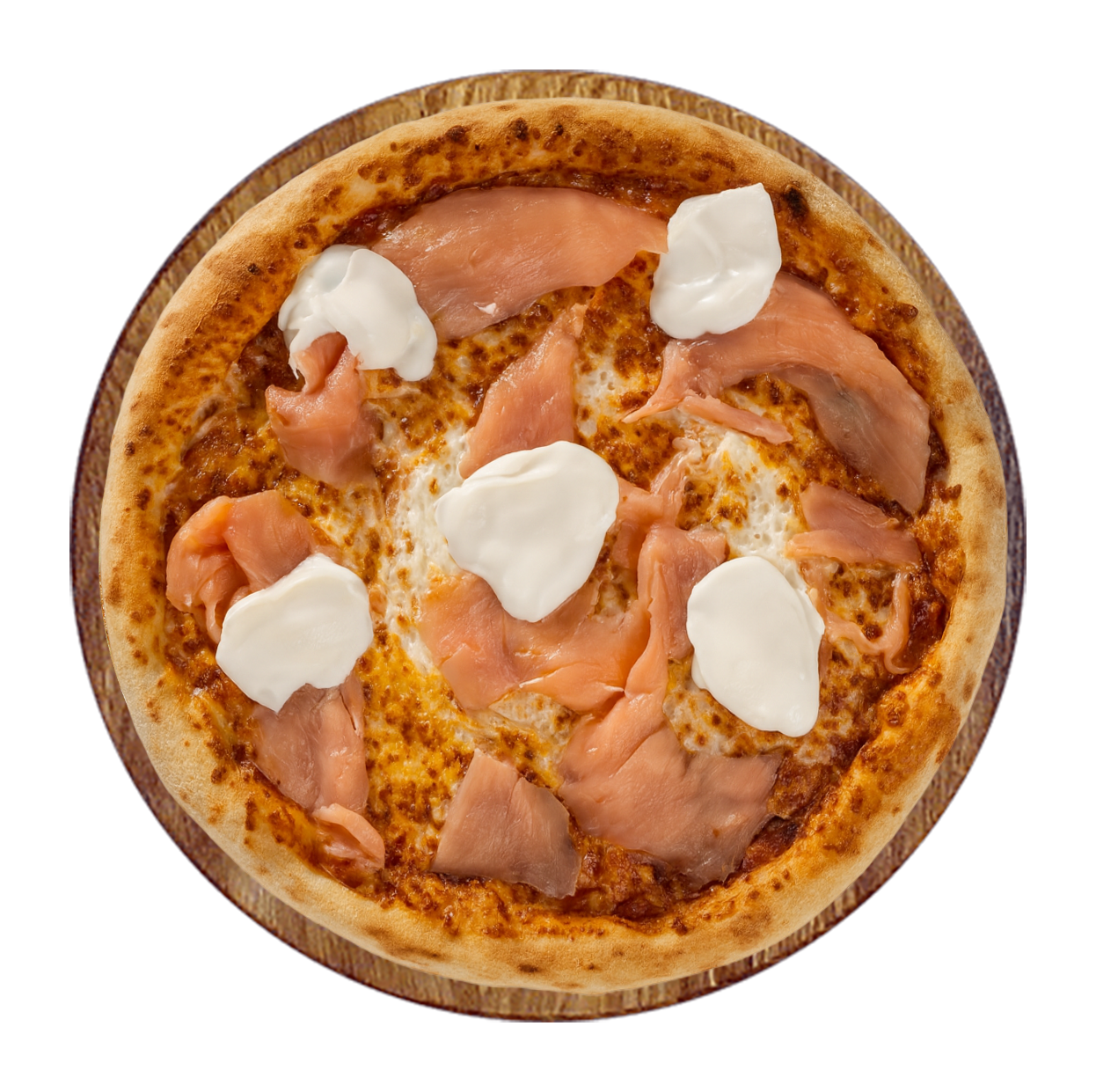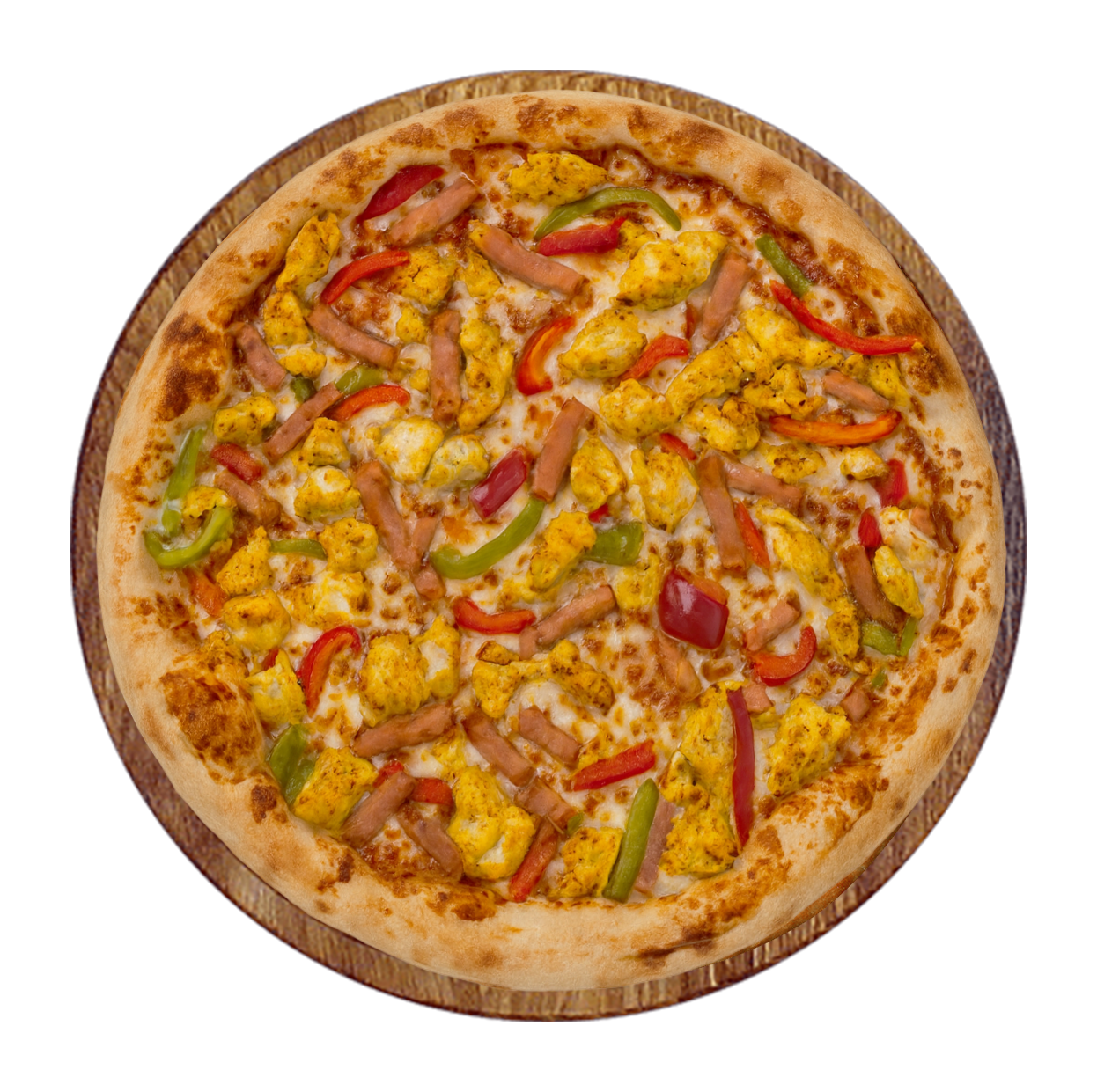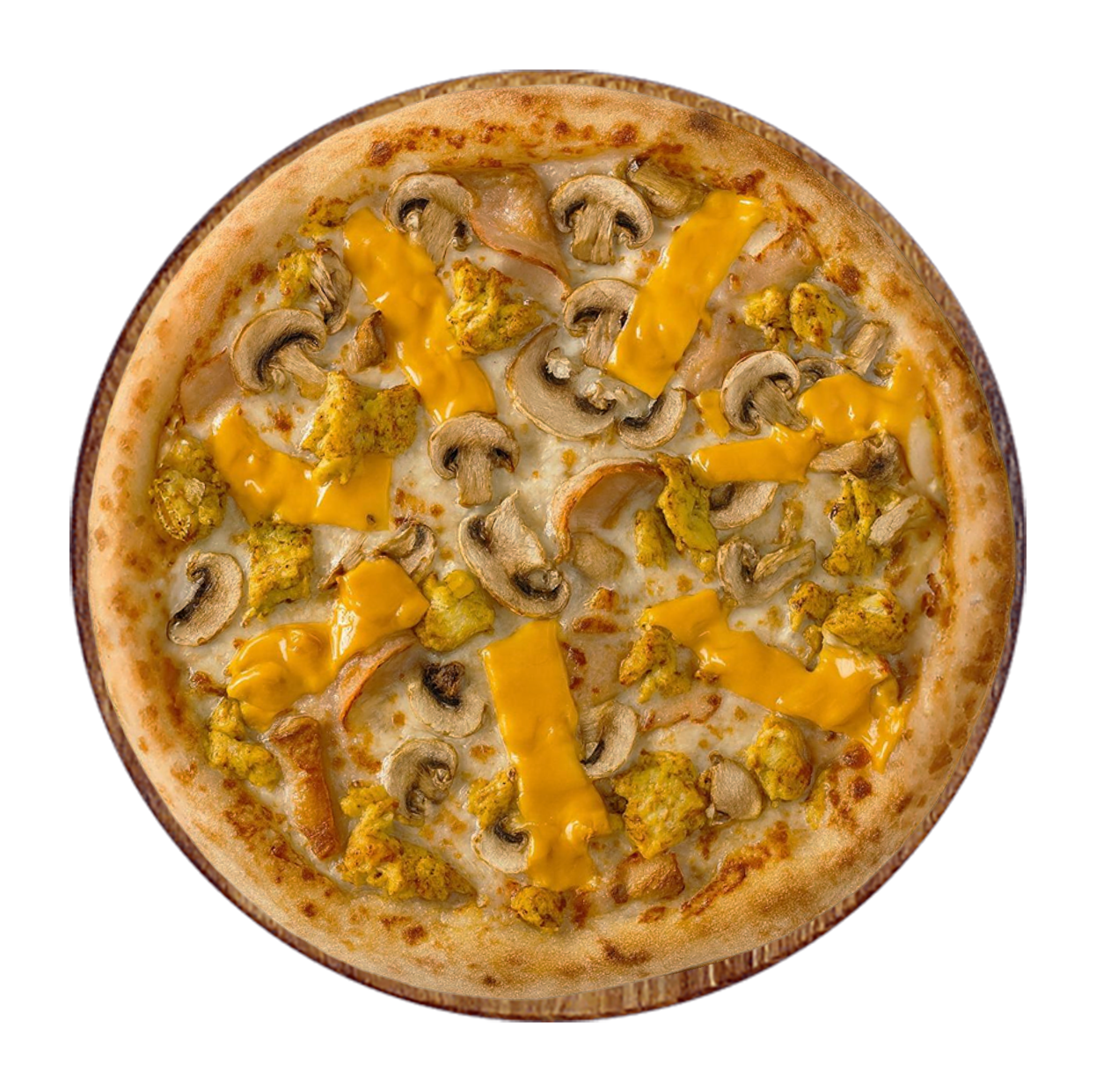 Crème fraîche, mozzarella, poulet fumé, chicken curry, champignons, cheddar.