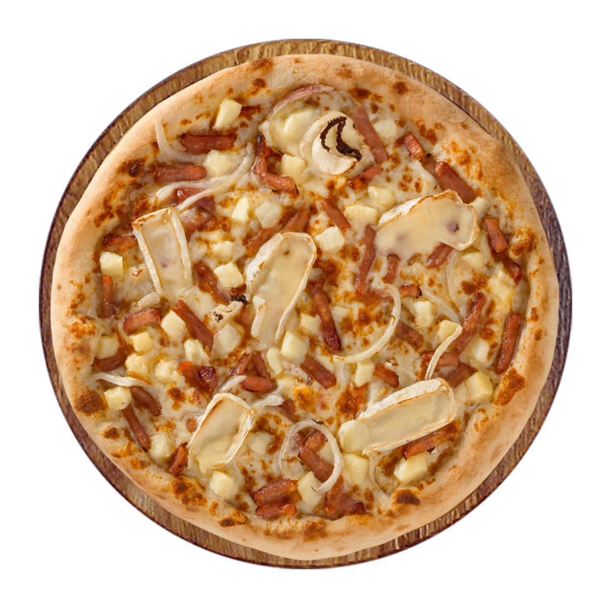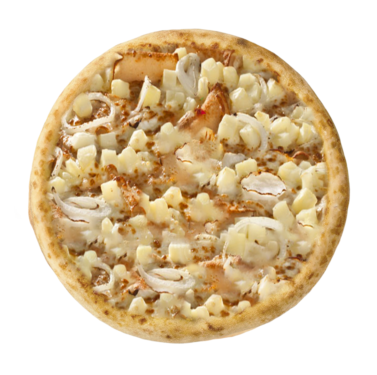 Crème fraîche, mozzarella, poulet fumé, oignons rouges, pommes de terre.