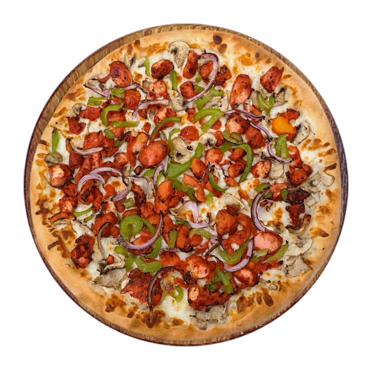Crème fraîche, mozzarella, chicken tandoori, oignons rouges, champignons, poivrons.